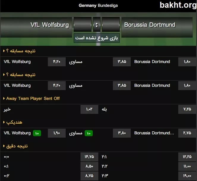 سراغ دیدار وولفسبورگ و دورتموند از لیگ آلمان رفتیم. برای این مسابقه چیزی حدود صد آیتم شرط بندی داریم که عدد بدی نیست. شرط بندی بالا و پایین محدود به 2.5 و 5.5 میشود که در نوع خود عجیب به نظر میرسد. برخی آیتمها تکراری هستند.