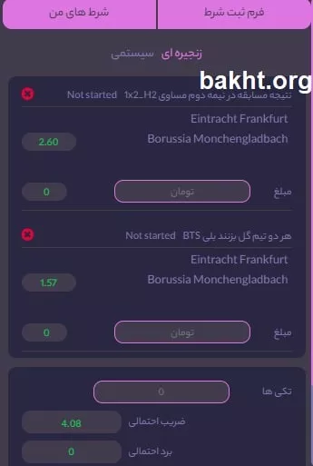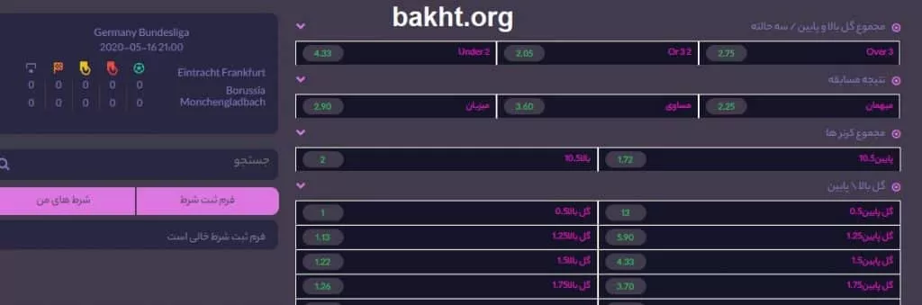 سراغ یکی از بازیهای بوندسلیگا رفتیم. چیزی نزدیک به صد آیتم برای شرط بندی این مسابقه داریم. با این حال خبری از محدودیت 2.5 برای شرط بندی مجموع و یا آیتمهای تکراری نیست. آیتمهای خوبی گرد هم آورده شدهاند و بعید است مشکل خاصی از جهت تنوع احساس کنید.