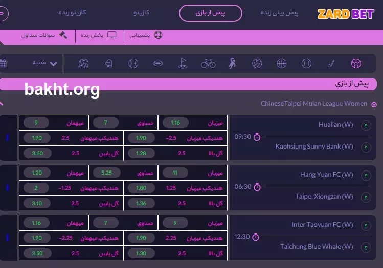 شرط بندی ورزشی در زرد بت به این صورت است. برای اینکه فوتبال داشته باشیم، تاریخ را روی روز شنبه گذاشتیم. با این حال از نظر دستهبندی چندان درست عمل نشده و بخش سوم مربوط به بوندسلیگا میشود. در بالای لیست لیگ بانوان تایپه به چشم میخورد. امکانی جهت شخصی سازی در این صفحه وجود ندارد.