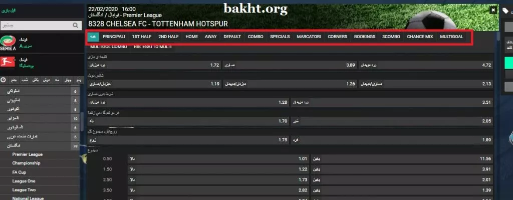 برای بررسی آیتمهای شرط بندی یک بازی را انتخاب میکنیم. به عنوان مثال در عکس زیر همانطور که میبینید مسابقه چلسی-تاتنهام از چارچوب لیگ برتر انگلیس انتخاب شده است. آنها صدها آیتم برای شرط بندی در نظر گرفتهاند، به اندازهای که در مارکت ایران منحصر به فرد است اما برای گیج نشدن کاربر، قسمت دسته بندی انواع شرط بندی دارند که میتوانید راحت تر در آنجا شرطی که میخواهید را انتخاب کنید. بر فرض قصد بستن روی کرنرها را دارید، از قسمت بالا corners را انتخاب کنید. در قسمت کرنرها با چنین گزینههایی برای شرط بندی روبرو هستید: مجموع کرنرها (از پایین 8.5 تا بالای 12.5)، زوح و فرد بودن کرنرها، اولین و آخرین کرنر، کرنرها میزبان و مهمان به صورت جدا، تعداد کرنرهای نیمه اول، نیمه دوم و اینکه کدام تیم در هر نیمه کرنرهای بیشتری میزند و در نهایت بازه تعداد کرنرها.