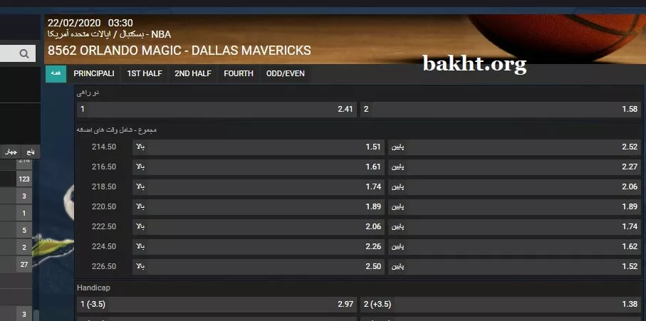 شرط بندی بسکتبال این سایت را نیز بررسی کردیم. لیگ کشورهای متفاوتی پوشش داده شده که برای مثال در خصوص آمریکا، دو لیگ NBA و NCAA را شامل میشود. سراغ بازی فردای اورلاندو مجیک و دالاس موریکس رفتیم. اینجا هم گزینهها برای شرط بندی کم نبود. اینجا هم قادر به شرط بندی روی گزینههای بسیار با دسته بندیهایی در بالای صفحه هستیم. شرط بندی بالا و پایین از پایینِ 214.5 و بالای 226.5 ادامه دارد که طیف گستردهای به نظر میرسد.