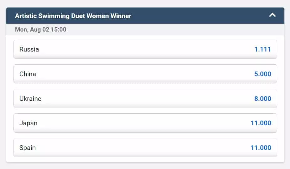 در شنای دو نفره ضریب قهرمانی روسیه 1.111 است. چین با ضریب 5 و اوکراین با ضریب 8 در جایگاههای بعدی قرار دارند.