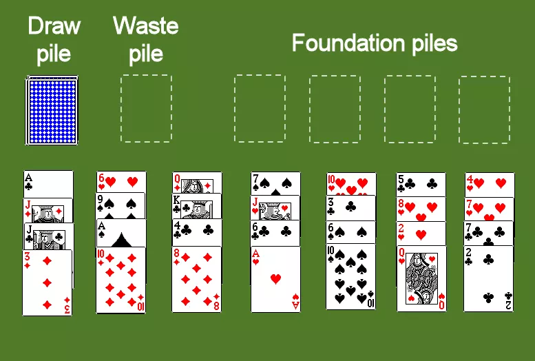 بازیکن کارتها را به هم میریزد و تابلویی از 2 کارت، متشکل از 7 ستون 4 کارتی که همه کارتها رو به بالا هستند را ایجاد میکند. کارتها هر ستون روی هم قرار میگیرند به طوری که سه کارت اول در هر ستون کاملا پوشانده شده باشند و فقط انتهای آنها قابل مشاهده باشد تا بازیکن بتواند رتبه آن را بخواند و فقط کارت چهارم ستون کاملا نمایان است. 24 کارت باقیمانده به صورت انباشته رو به پایین روی هم چیده میشوند و یک دسته کارت قرعه را تشکیل میدهند. در کنار دسته کارت قرعه باید دسته کارت زباله رو به بالا نیز وجود داشته باشد. دسته کارت زباله در ابتدایی بازی خالی است. باید روی میز چهار قسمت خالی نیز برای انجام بازی تعبیه شود، در اصلاح به این قسمتهای خالی پایه گفته میشود. در زیر یک نمونه طرح اولیه بازی نشان داده شده است.