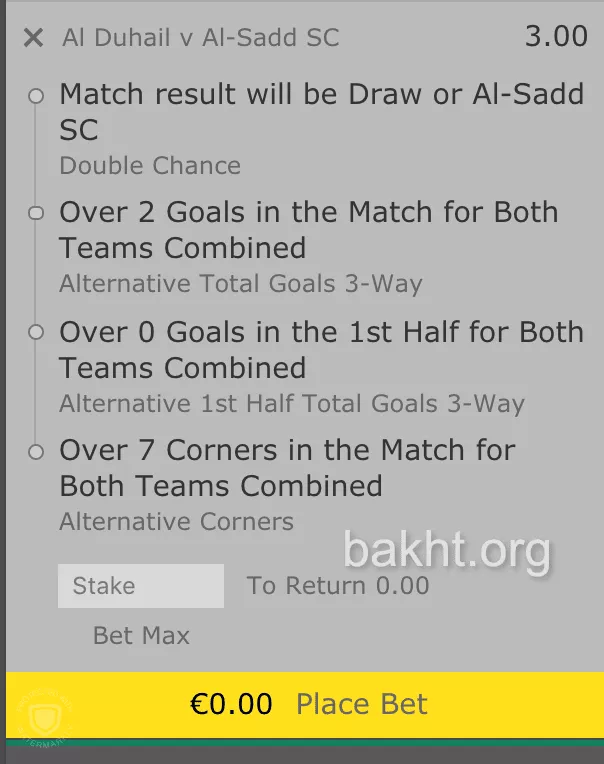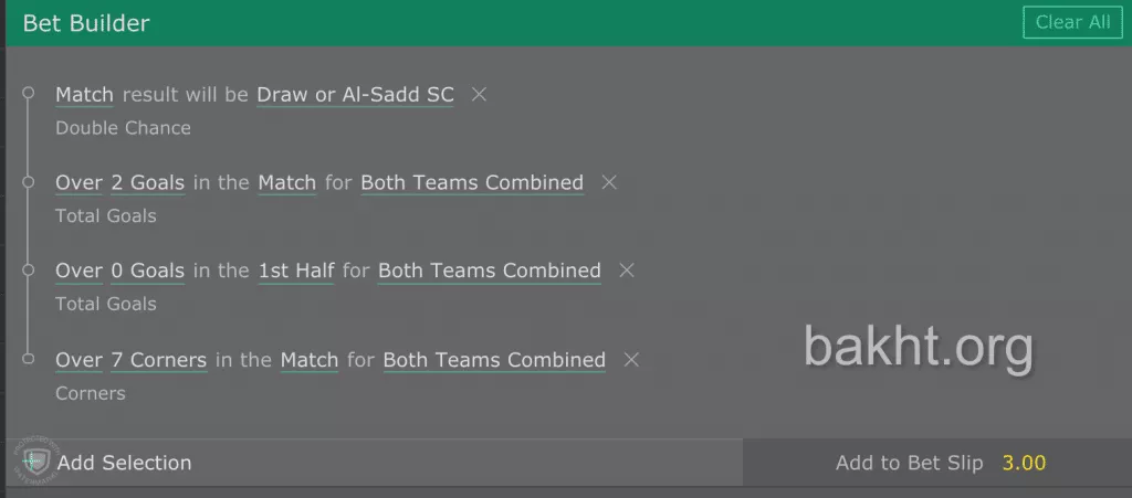 با ورود سایت bet365 به این عرصه و خلق آپشنِ Bet Builder یا بت بیلدر، حالا کار آسان به نظر می رسد. مثلا فرض کنید قصد دارید روی بازی الدحیل و السد در لیگ قهرمانان آسیا، میکس ببندید. با رفتن به بازی و انتخاب گزینه Bet Builder، همه چیز فراهم است. در اینجا تمام آپشن هایی که قبلا به صورت جدا در اختیار شما بود، می توانند به صورت میکس بسته شوند. مثلا اگر ما پیش بینی کنیم السد نمی بازد، بازی بالای ۲ گل دارد، نیمه اول حتما گل دارد و حداقل ۸ کرنر در بازی زده می شود، میکسی با ضریب ۳ ساخته ایم.