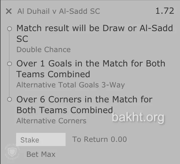 مثلا میکسی ساده و سه قسمتی شامل نباختن السد، حداقل ۲ گل در بازی و رخ دادن حداقل ۷ کرنر، ضریبی برابر با ۱.۷۲ دارد.