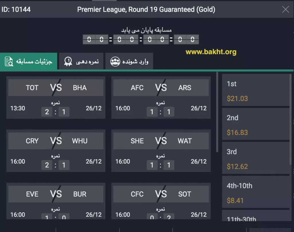 جلوی هر لیگ، مبلغ ورودی برای ورود را نوشته که برای شرکت در مسابقه پرداخت کنید.