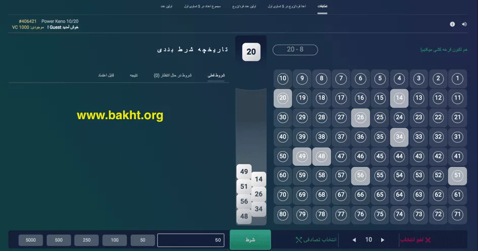 در اینجا در سمت راست صفحه، اعداد بین ۱ تا ۸۰ قرار دارد که شما می توانید ۱۰ عدد را به صورت اختیاری انتخاب کنید.