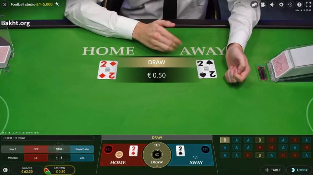دیلر دو کارت به پشت روی میز میگذارد. روی میز دو عبارت درج شده است. این دو عبارت Home و Away هستند. به معنی خانگی و خارج از خانه. در واقع شما دارید رقابت دو تیم را با دو کارت شبیه سازی میکنید. بازیکن روی این شرط بندی میکند که کدام کارت ارزش بالاتری دارد. سه حالت متفاوت این بین میتواند شکل بگیرد: