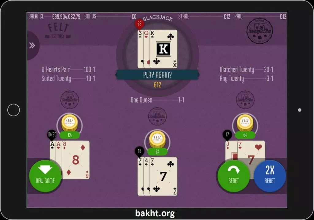اگر دیلر، نتواند 21 بسازد، بازیکن با ضریب 2.5 برنده خواهد بود. امکان هیت (کارت مجدد)، دبل داون (بیشتر کردن مبلغ شرط بندی) و اسپلیت در دسترس است. اسپلیت وقتی است که دو کارت اول شما جفت هستند. در این حالت میتوانید آنها را به دو دست متفاوت ببرید و با همان مبلغ شرط بندی اولیه ادامه دهید.