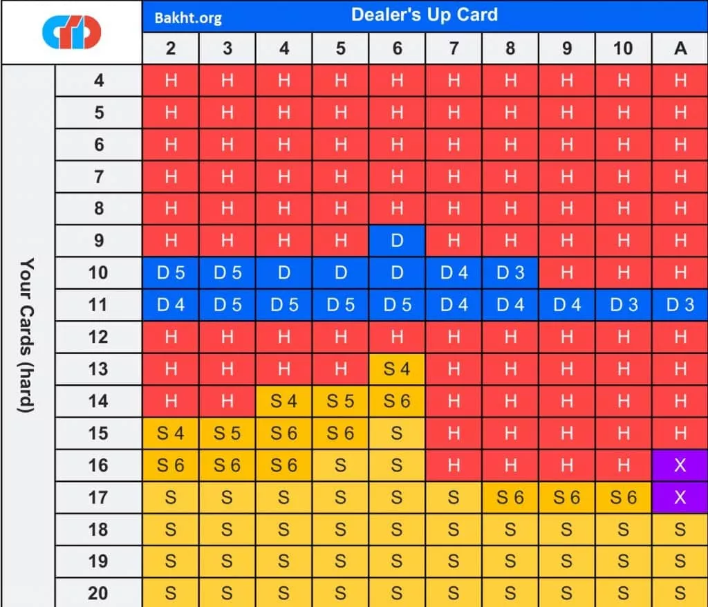 چنین چیزی به عنوان استراتژی مناسب بازی مطرح است. H به معنی هیت (کارت بیشتر)، D به معنی دو برابر کردن مبلغ شرط بندی، S به معنی اسپلیت و X بع معنی کنارهگیری است. در واقع مثلا اگر دو کارت اول بازیکن حاوی 16 هستند و دیلر کارت آس رو کرده است، جا داره که کنارهگیری کنید.