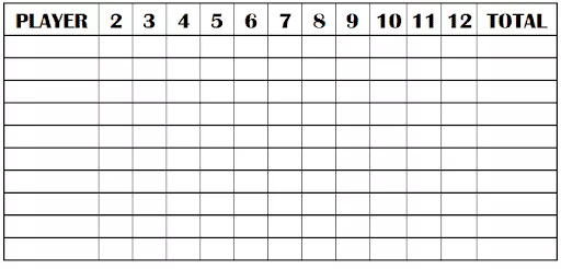 ۳- برای یادداشت کردن امتیازات هر بازیکن، به یک خودکار و یک برگه کاغذ نیز احتیاج دارید. میتوانید یک جدول رسم کنید و آن را با ۱۱ ستون مرتب کنید. سپس به تعداد بازیکنان ردیف رسم کنید.