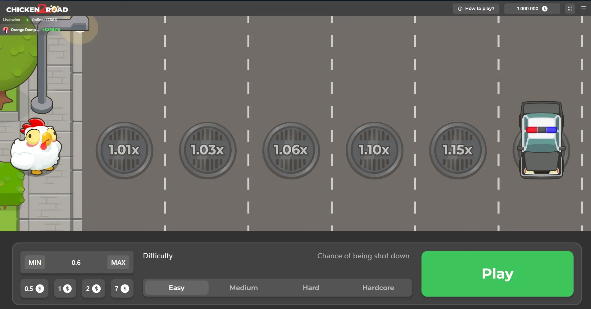 جاده مرغ (Chicken Road) یک بازی شرطبندی با سبک بازی انفجار است. در این بازی، در هر دور تصمیم میگیرید که مرغ به لاین بعدی جاده برود یا متوقف شود و موجودی را برداشت کنید. اگر به لاین بعدی برود و زنده بماند شرط در عددی ضرب میشود و موجودی افزایش پیدا میکند.