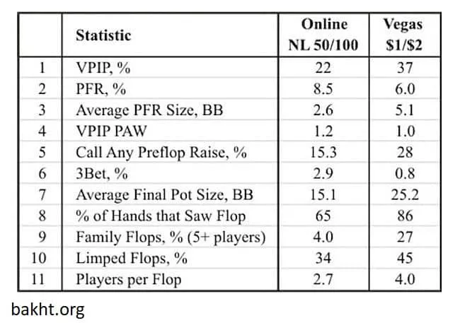 این جدول (سطر 1) نشان می دهد که بازیکن حضوری 1 به 2 هولدم (شرط های حضوری)، به طور متوسط 37 درصد VPIP ثبت می کند که در واقع 70 درصد شل تر از همین میزان برای بازیکنان آنلاین (22 درصد) است. مشخص است که بازیکنان آنلاین، بسیار سفت تر (بازی کردن تعداد کمتری از دست ها نسبت به میانگین بازی یا بازیکنان) بازی می کنند، ولی سوال اصلی این است که در پوکر، با چه مقداری از دست هایتان وارد بازی شوید؟