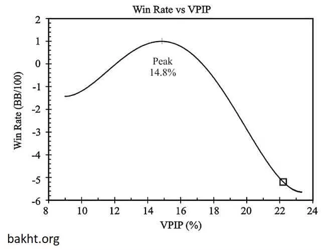 در مطالعاتم، تاریخچه 6 میلیون دست پوکر آنلاین را مورد بررسی قرار دادم. شکل 2 در پایین منحنی نرخ برد میانگین برای بازیکنان آنلاین با VPIP مختلف را نشان می دهد.