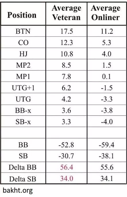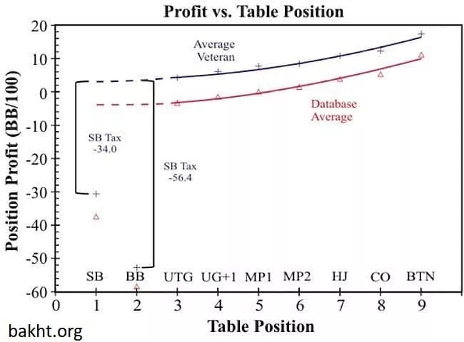 حتما از اهمیت موقعیت در پوکر مخصوصا هولدم نامحدود شنیده اید. پوکر بازی داده ها است. هر چه موقعیت بهتری داشته باشیم، داده های بهتری هم داریم. نمودار پایین که سود میانگین از هر موقعیت پوکر ثبت شده توسط پیشکسوتان این بازی را مدنظر داشته باشید. پیشکسوتان گروهی 2 هزار نفره در بین 130 هزار داوطلب تحقیقات من هستند که بیشترین دست ها را بازی کرده اند. این بازیکنان به طور میانگین از سایر بازیکنان آنلاین بهتر هستند.