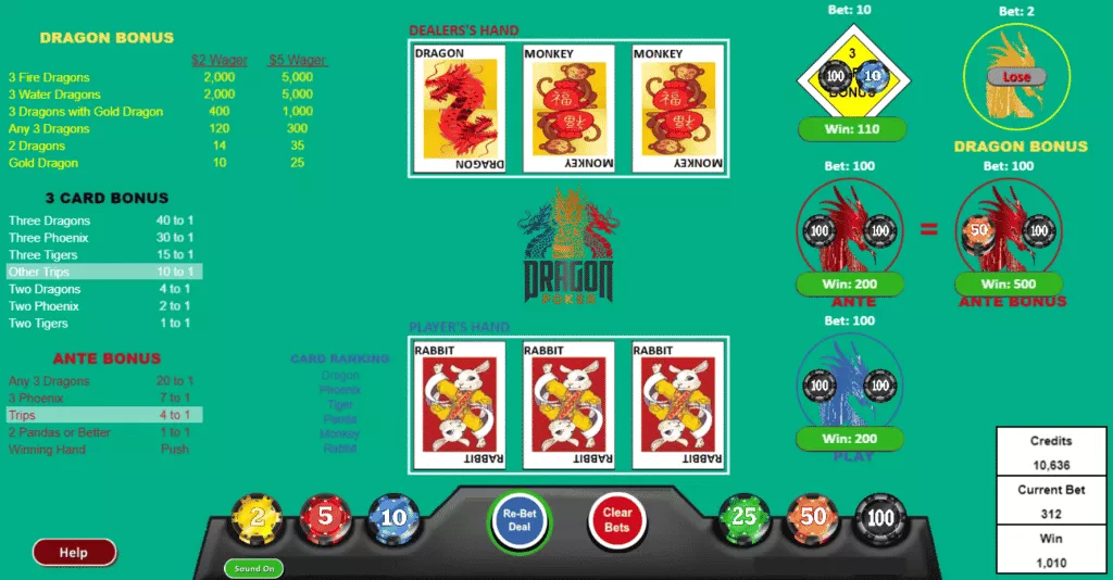 در مثال بالا دست ما که ۳ خرگوش دارد، از دست دیلر با جفت میمون بالاتر است. بازی، برد را در تصویر با میزان بازگشت (return) نشان میدهد. این میزان شامل شرط اصلی نیز میشود. ما ۱۰۰ دلار روی هر شرط Ante، Ante بونس و شرط پلی (play) میگذاریم. شرط Ante و پلی هر کدام ۱۰۰ دلار دیگر برنده شدند. میزان پرداختی شرط این شرط، ۴ به ۱ میباشد. شرط ۱۰ دلاری ما روی شرط ۳ ورقی برای تری آو ا کایند پایین به میزان ۱۰ به ۱ برنده شد. شرط دراگون بونس را نیز باختهایم زیرا در دست ما اژدها وجود ندارد.