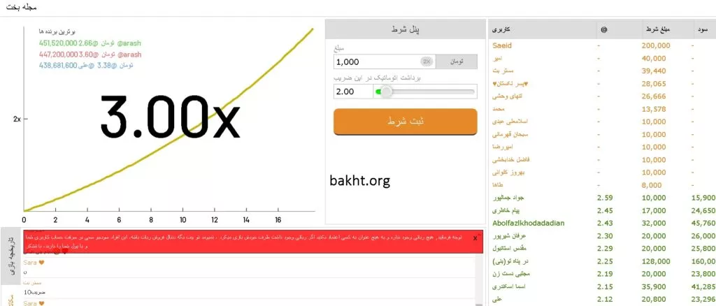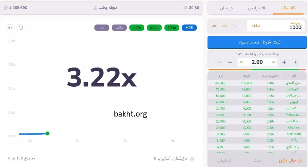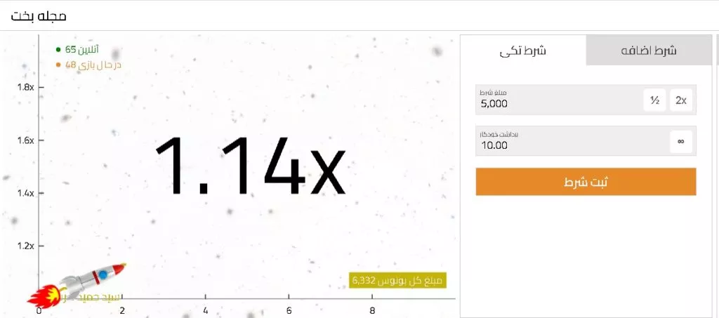 در سمت راست صفحه شرطهای بسته شده در هر راند و نام کاربر نشان داده میشود. پس از شروع بازی در صورتی که قبل از انفجار نمودار مبلغ خود را برداشت کنید، سود خواهید داشت.