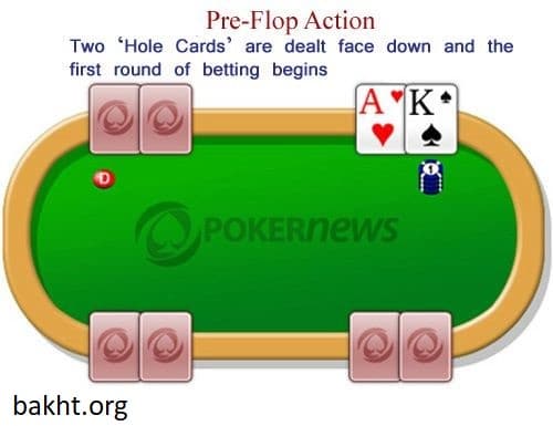 هر بازیکن 2 کارت می گیرد و هدف از بازی ساخت بهترین دست 5 تایی کارت ها است. بازی در جهت عقربه های ساعت انجام شده و از سوی بازیکن سمت چپ دیلر باتن، آغاز می شود. دو بازیکن سمت چپ دیلر باتن که شرط اجباری کوچک و بزرگ خوانده می شوند، باید برای شروع شرط بندی، اقدام به قرار دادن مبالغی مشخص و اجباری در پات کنند. در ادامه، بازی در پیش فلاپ، فلاپ، ترن و ریور، که خیابان های پوکر خوانده می شوند، انجام می شود.