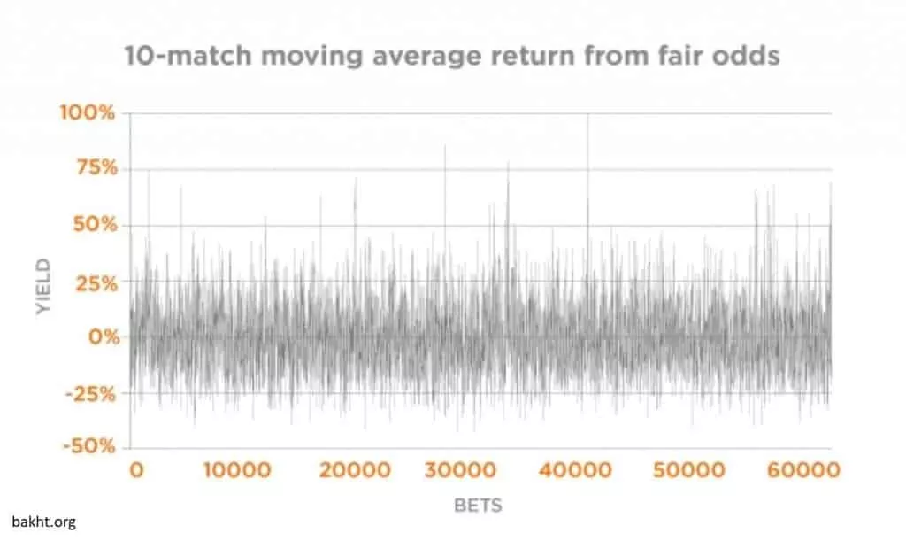 با این حال، باید بگوییم مقدار نوسانات گاهی اوقات به اندازه کافی بالا می رود تا بیش از 50 باشد. اگر یکی از شرط بندان بعد از 30 بار شرط بندی، بازدهی بیش از 50 درصد داشته باشد، معمولا موفقیت خود را به مهارت یا خوش شانسی مربوط می داند. از سوی دیگر، اگر درصد موفقیت فرد به زیر 30 درصد برسد، شک و تردید او بیشتر شده و به تدریج به میزان میانگین نزدیک می شود.