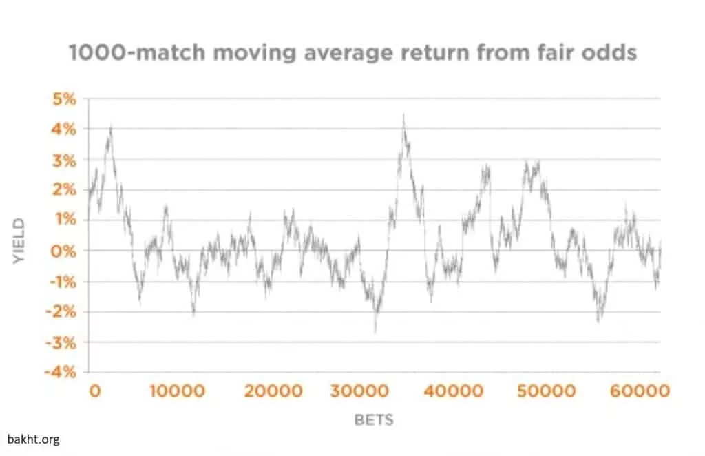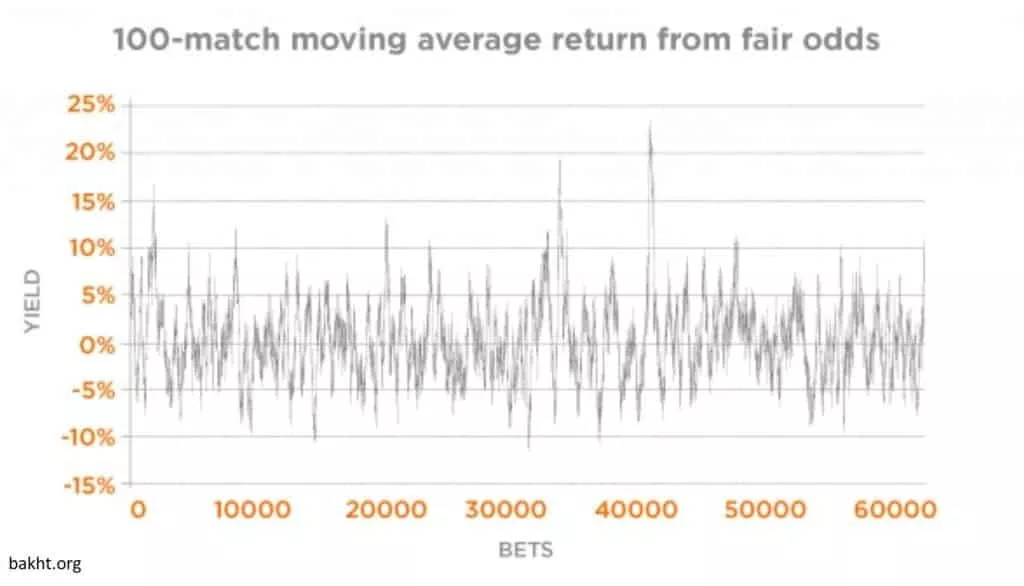 برای اینکه مطمئن شویم کل نتیجه هر بازی صرفا براساس تصادف تعیین نمی شود، به عنوان یک تمرین مفید می توان میزان متغیر تصادفی دقیق موجود در نتایج ورزشی را تحلیل کرد. براین اساس می توان تغییرات دنباله ای از سودهای فرضی بازگشتی براساس ضرایب منصفانه در بازه های زمانی مختلف را بررسی کرد. ضرایب شرط بندی صرفاً تخمین های احتمالی انتظارات ما را نشان می دهد. خرد جمعی (برآیند نظرات گروهی از افراد به جای یک فرد متخصص) ما را مطمئن می کند که به طور میانگین، این ضرایب نشان دهنده شاخصی بسیار قابل اعتماد از احتمالات “واقعی” است. با این حال، تصادف به ما ثابت می کند نتایج معمولا چیزی غیر از انتظارات ایده آل عمومی است.