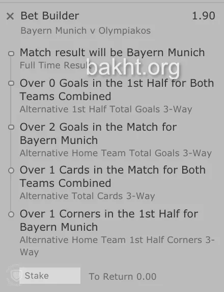همه بازی های بایرن مونیخ و همه بازی های المپیاکوس در این فصل لیگ قهرمانان، حداقل ۳ گل داشته است! از طرفی انتظار داریم حداقل یک گل در نیمه اول ببینیم. در ۹۵ درصد بازی های این فصل بایرن، حداقل یک گل در نیمه اول مشاهده کرده ایم. حداقل ۲ کارت زرد در بازی و حداقل ۲ کرنر در نیمه اول برای بایرن مونیخ، انتخاب های بعدی ما هستند. بایرن مونیخ در تمام بازی های خانگی این فصل، حداقل ۲ کرنر در نیمه اول زده است و از طرفی تیم یونانی معمولا کارت های زرد زیادی را دریافت می کند.