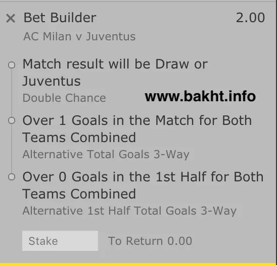 گزینه دوم ما، حداقل ۲ گل در بازی است. ۸ بازی از ۱۰ جدال اخیر دو تیم، حداقل ۲ گل به خود دیده است. ۷ دیدار خارج از خانه پیاپی یوونتوس، حداقل ۲ گل داشته که این آمار را می توان به ۱۳ بازی پیاپی در همه رقابت ها تعمیم داد. برای میلان، این عدد ۵ بازی از ۶ دیدار اخیر و ۴ بازی خانگی پیاپی است. دو تیم در وضعیتی هستند که بتوانند حتی بیشتر از ۲ گل به ثمر برسانند.