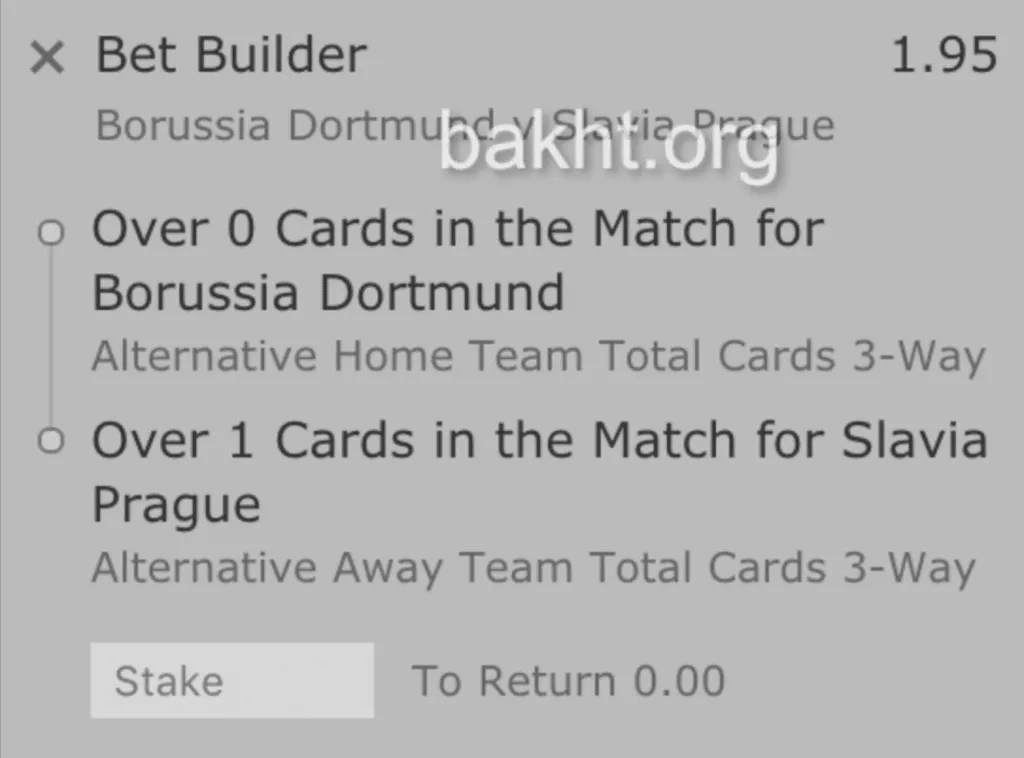 انتخاب دوم ما، حداقل ۲ کارت زرد برای اسلاویا پراگ است. فوتبال تهاجمی دورتموند باعث می شود که رقبا همیشه روی بازیکنان این تیم خطا کنند. اسلاویا پراگ در ۲ بازی خارج از خانه اروپایی خود، حداقل ۲ کارت زرد گرفته است. رقبای دورتموند در آلمان در بازیهای اروپایی هم حداقل ۲ کارت زرد در وستفالن گرفتهاند.