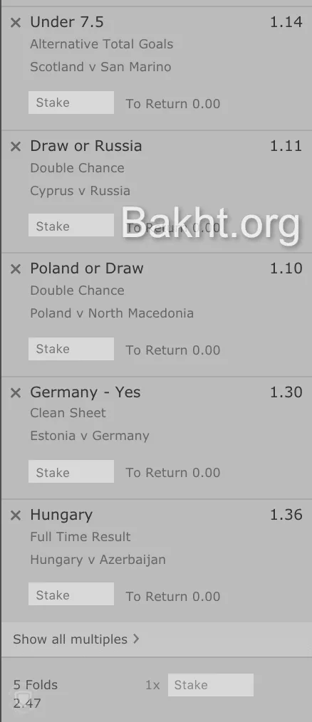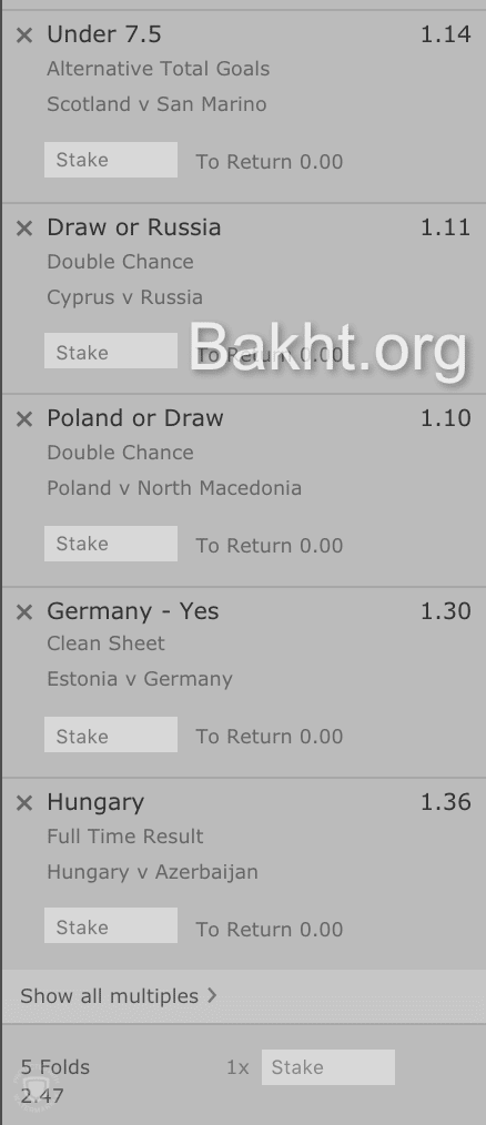 در این میکس، انتخاب اول مجموع گل بازی اسکاتلند و سن مارینو زیر ۷.۵ است. اسکاتلند در شرایط خیلی خوبی نیست و انتظار داریم بازی به ۸ گل یا بالاتر نرسد. برد مساوی روسیه، انتخاب دوم ماست. روسیه با یک تساوی به یورو صعود می کند. برد مساوی لهستان هم در نظر داریم. لهستان شرایط ایده آلی دارد و احتمالا بازی را ببرد. آلمان و استونی به هم گل نمی زنند، گزینه چهارم میکس است. بعید است استونی بتواند موقعیت خاصی روی دروازه آلمان خلق کند. در پایان برد مجارستان، آخرین گزینه ما است. مجارها برای امید داشتن به صعود، باید امروز از سد حریف نه چندان قدرتمند خود بگذرند.