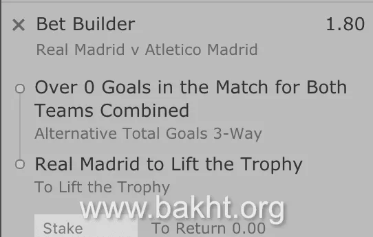 انتخاب اصلی ما برای این بازی، قهرمانی رئال مادرید است. این گزینه بدین معنی است که اگر رئال مادرید حتی در ضربات پنالتی هم برنده شد، شرط پیروز خواهد شد. با انتخاب این گزینه، ریسک پایین تر می آید اما به صورت کلی، گزینه هایی مثل شانس دو برابر رئال(برد مساوی) و حتی برد رئال مادرید، به احتمال بالا رخ می دهد.