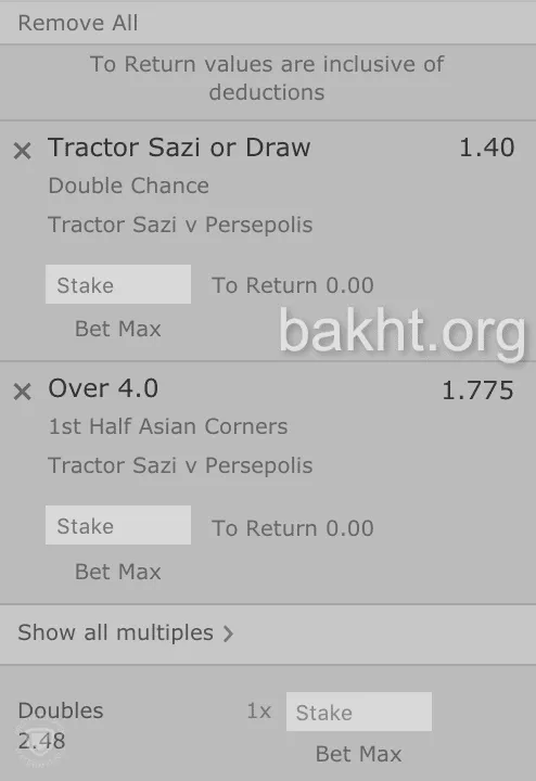 برای بازی امروز تراکتور-پرسپولیس، پیش بینی می کنیم که میزبان تبریزی بازی را نمی بازد (برد مساوی) که ضریبی برابر با ۱.۴۰ دارد. اگر می خواهید مبلغ بیشتری را شرط بندی کنید، می توانید روی همین گزینه متوقف شوید اما ما تصمیم گرفته ایم که این گزینه را با هندیکپ آسیایی کرنر در نیمه اول در عدد ۴، ترکیب کنیم. این بدین معناست که میکس شرط بندی ما زمانی برنده خواهد بود که تراکتور نبازد و در نیمه اول، حداقل ۴ کرنر زده شود. ضریب این شرط ۲.۴۸ است اما همان طور که قبلا در شرط بندی حرفه ای گفتیم، شاید در سایت های شرط بندی ایرانی یا خارجی حتی بیشتر باشد.