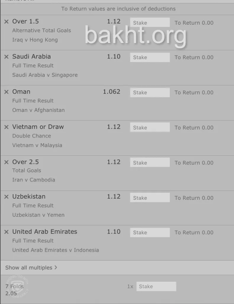 این میکس شامل مجموع گل های بازی عراق و هنگ کنگ بالای ۱.۵، برد عربستان، برد عمان، برد مساوی ویتنام، بالای ۲.۵ گل بازی ایران و کامبوج، برد ازبکستان و برد امارات می شود. اگر قصد داشتید ضریب را حتی از این بالاتر ببرید، پیشنهاد ما به شما، گزینه مثل برد ویتنام، بالای ۲.۵ گل عراق و بالای ۳.۵ ایران است.