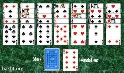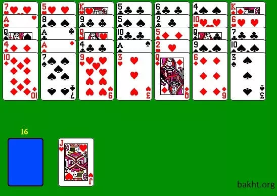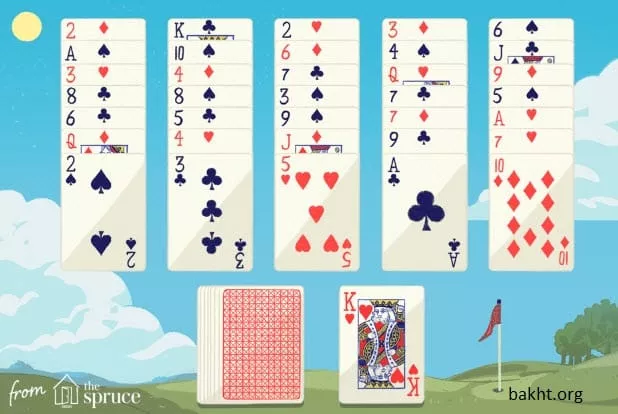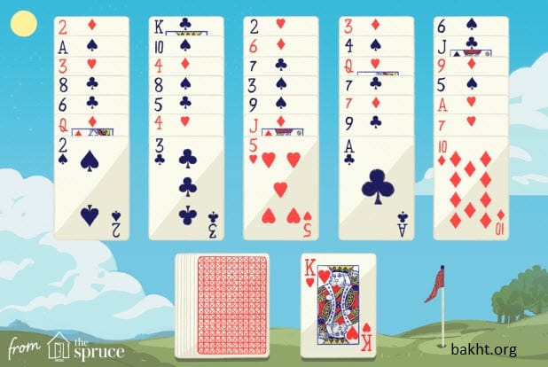باید در ابتدا 7 ستون 5 کارتی بسازید. در هر ردیف، کارت را تا نیمه روی کارت قبلی می گذاریم. بالاترین کارت از کارت های باقیمانده را برمی گردانیم تا مخزن ایجاد شود.