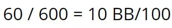 با این حال، کسانی که هولدم نامحدود نقدی آنلاین بازی می کنند، معمولا نرخ بردشان را براساس شرط بزرگ به 100 دست (100/BB) تخمین می زنند. فرض کنید یک نمونه از همین بازیکنان 60 دلار در 600 دست هولدم نامحدود 0.5 به 1 دلار (شروط اجباری کوچک و بزرگ)، سود می کند. شرط بزرگ در این بازی یک دلار است به این معنا که بازیکن در نهایت 60 شرط بزرگ به جیب زده است. اینجا با نرخ بردی به میزان 10 شرط بزرگ در هر 100 دست به شرح فرمول زیر روبرو هستیم:
