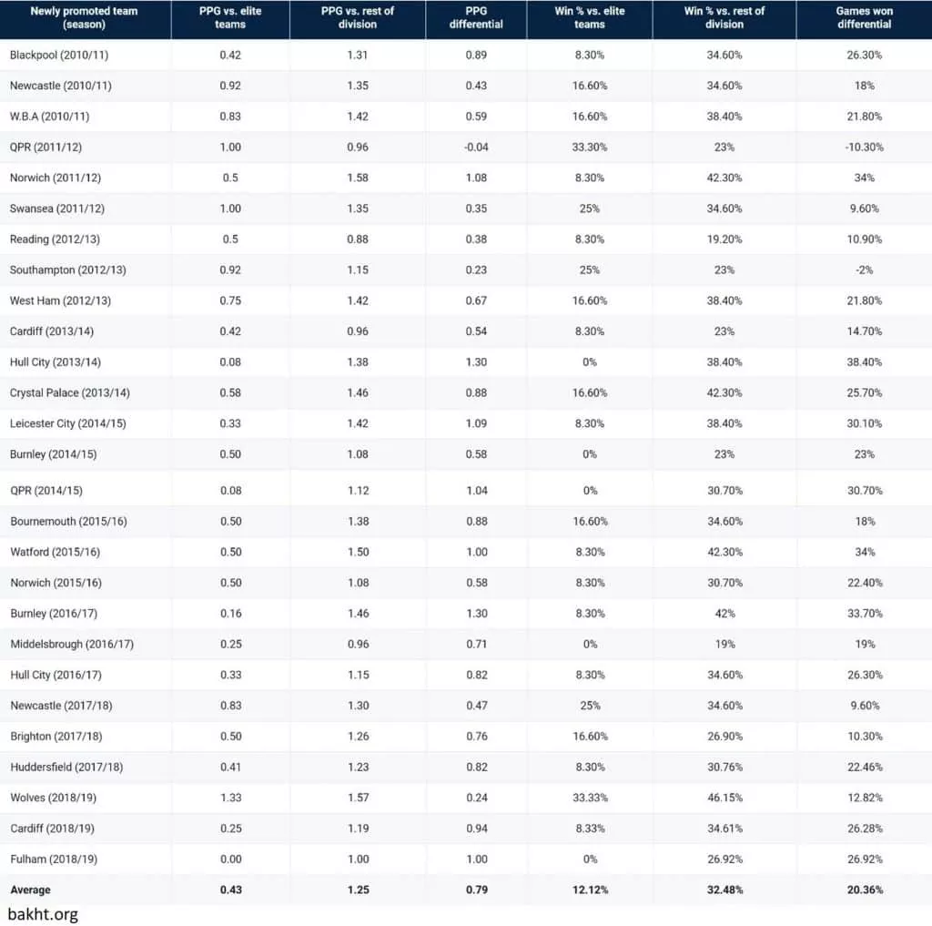 در جدول بالا، ستون اول مربوط به تیم های تازه وارد است. ستون های دوم و سوم امتیازات کسب این تیم ها به ترتیب مقابل تیم های برتر و سایر تیم ها را نشان می دهد. ستون سوم تفاوت امتیازات را لیست کرده است و در ستون های بعدی به ترتیب درصد برد مقابل بزرگان، درصد برد مقابل سایر تیم ها و تفاوت درصدی میزان بردها را مشاهده می کنید. ردیف آخر هم مربوط به میانگین آمار است.