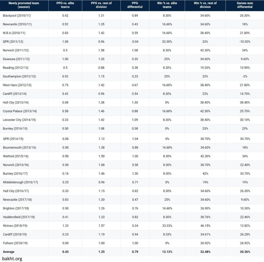 در جدول بالا، ستون اول مربوط به تیم های تازه وارد است. ستون های دوم و سوم امتیازات کسب این تیم ها به ترتیب مقابل تیم های برتر و سایر تیم ها را نشان می دهد. ستون سوم تفاوت امتیازات را لیست کرده است و در ستون های بعدی به ترتیب درصد برد مقابل بزرگان، درصد برد مقابل سایر تیم ها و تفاوت درصدی میزان بردها را مشاهده می کنید. ردیف آخر هم مربوط به میانگین آمار است.