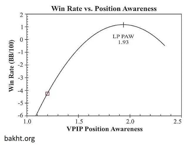در مطالعه ای، 6 میلیون دست پوکر را تحلیل کردم و شکل زیر میانگین نرخ برد آنلاین را با میزان آگاهی موقعیت مقایسه کرده است: