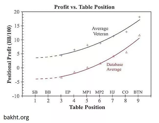 منحنی پایین سود بدست آمده در هر میز را برای تمام بازیکنان بانک اطلاعاتی نشان می دهد. این بازیکنان نمونه، به طور میانگین 5 شرط بزرگ به ازای هر 100 دست در کات آف برنده می شوند، ولی 3.5 شرط بزرگ در UTG واگذار می کند. همچنین 3 برابر مبلغ کات آف را موقع حضور در باتن، برنده می شوند. از این رو، نه تنها موقعیت ارتقا یافته سود را بیشتر می کند، کسب سودمان با نزدیک شدن به باتن، شتاب بیشتری هم می گیرد.