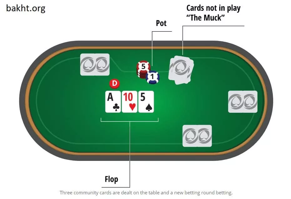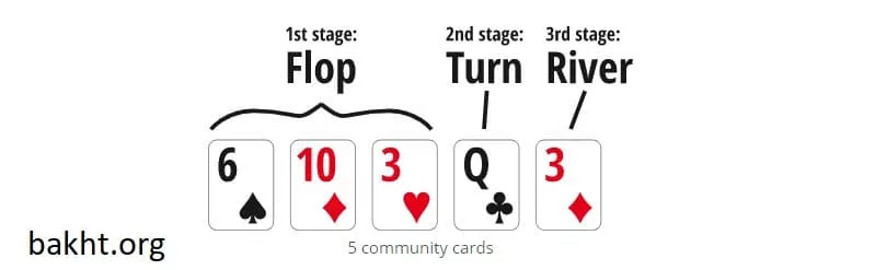 پنج کارت عمومی براساس عکس بالا، در 3 مرحله فلاپ (3 کارت)، ترن (یک کارت) و ریور (یک کارت)، توزیع می شوند. بازیکنان در ادامه سعی می کنند بهترین 5 تایی ممکن را از بین 7 کارت در اختیار، بسازند. این ترکیب می تواند با استفاده از هر دو کارت بازیکن در کنار 3 کارت عمومی، یک کارت بازیکن و 4 کارت عمومی یا حتی صفر کارت بازیکن و 5 کارت عمومی ساخته شود و محدودیتی وجود ندارد.