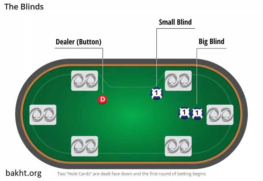 نشانک دیلر علاوه بر مشخص کردن وضعیت شروط اجباری، محل پخش کارت ها را هم مشخص می کند. بازیکن سمت چپ دیلر در شرط اجباری کوچک (Small Blind)، اولین کارت را دریافت می کند و دیلر در ادامه کارت ها را در جهت عقربه های ساعت برای بقیه هم پخش می کند تا هر بازیکن حداقل یک کارت دریافت کرده باشد. عکس زیر موارد تشریح شده را نشان می دهد: