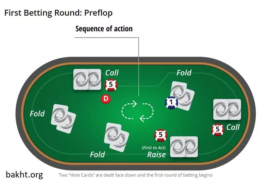در این دور شرط بندی و دورهای دیگر، اکشن توسط اولین بازیکن در سمت چپ نشانک دیلر آغاز می شود. در کنار 3 گزینه کال، افزایش و فولد کردن، بازیکنان الان می توانند چک هم بکنند یا پاس دهند. به این معنا که اگر قبل از او، شرطی مشخص نشده باشد، بازیکن می تواند بازی را به نفر بعدی پاس دهد.