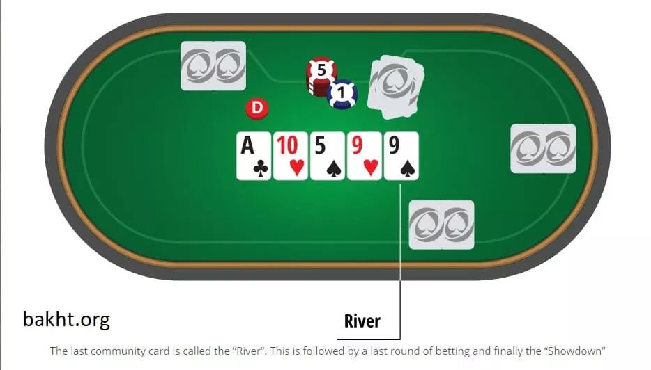 در نهایت به آخرین کارت می رسیم که به آن ریور (River) گفته می شود. بعد از رو شدن این کارت، دور شرط بندی دیگری آغاز می شود که همانند دورهای قبلی است. اینجا هم بازیکنان 4 گزینه کال، افزایش، فولد و پاس را در اختیار دارند. این مرحله از بازی هم در عکس زیر به تصویر کشیده شده است: