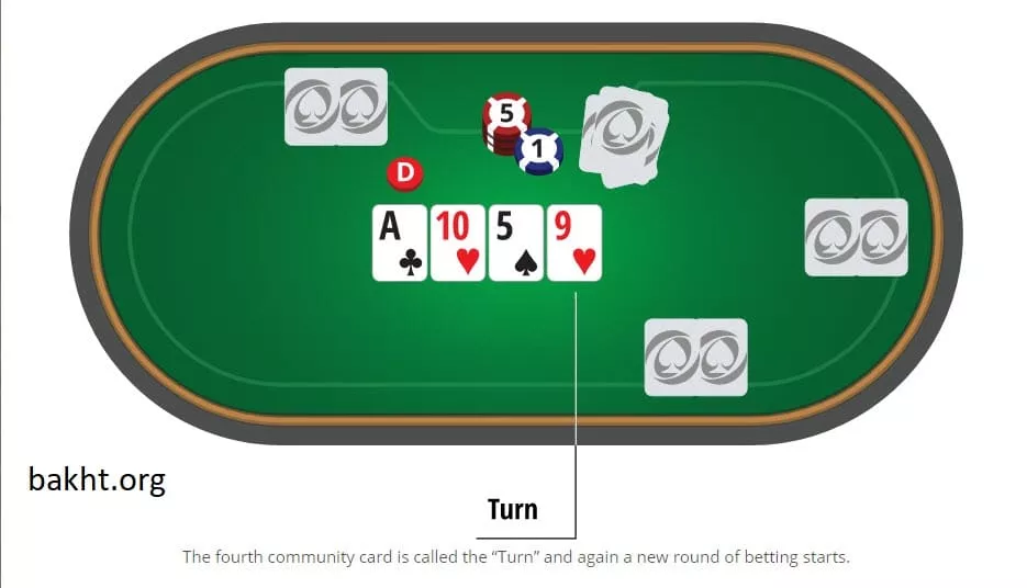 چهارمین کارت عمومی که به آن ترن (Turn) گفته می شود، بعد از فلاپ، رو می شود. بعد از این، دور شرط بندی دیگری به شکل قبل انجام می شود. اینجا هم بازیکنان 4 گزینه کال، افزایش، فولد و پاس را در اختیار دارند. عکس زیر در خصوص این دور از بازی است: