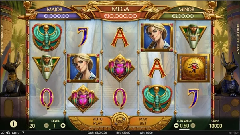 Mercy of the Gods Touch از مجموعهای از 5 گردونه، 3 ردیف و 20 خط پرداخت تشکیل شده است. مانند بسیاری از بازیهای اسلات آنلاین NetEnt، Mercy of the Gods شامل پیشنهادات پاداش سخاوتمندانهای است. نمادها مربوط به مضمون بازی شامل نوعی سوسک، افعیها، هوروس (خدای آسمان مصری)، کارتهای بازی کمارزش به سبک مصری، و همچنین شخصیتی با ارزش بالاتر از نوع فرعون و نماد چشم رع هستند. کاوشگر زن با ارزشترین نماد است. پنج تا از آن را بر روی یک خط پرداخت فعال فرود بیاورید، 80 برابر شرط خود دریافت کنید. این اسلات آنلاین شامل یک نماد وایلد است که میتواند جایگزین همه نمادهای استاندارد بشود، به جز اسکتر چشم رع که میتواند ویژگی اصلی بازی را فعال کند. و اسکتر پاداش مدال طلا، فعال کننده اصلی جکپات پاداش است.