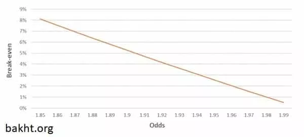 شاید این نکته توجهتان را جلب کرده باشد که درصد سود و ضرر برابر، مساوی با حاشیه سود بوک میکر است. مثلا در ضرایب 1.95، برای رسیدن به سود و ضرر برابر، تنها 2.6 درصد مواقع باید به عدد میانه برسید که در ضریب 1.87، این رقم 7 درصد می شود. به بیان دیگر، شرط بندی در ضریب 1.95 در مقایسه با 1.87، به ترتیب تفاوتی بین انتخاب ضریب 39.0 و 14.4 است. نمودار بالا روی اهمیت شرط بندی در بهترین ضرایب در دسترس موقع اجرای استراتژی میدلینگ، تاکید می کند.