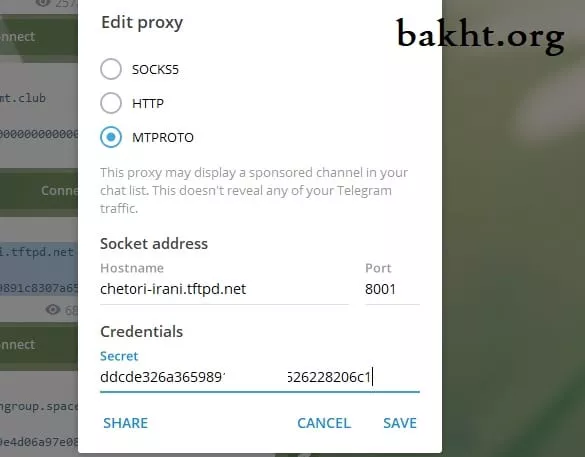 کانالهایی برای این منظور وجود دارد که در ادامه معرفی میشود. برای فعال سازی پروکسی، تنها لازم است که روی Connect یا لینک ارائه شده در هر پست کلیک کنید. همینطور میتوانید با وارد کردن سرور، پورت و رمز (سکرت)، این کار را در قسمت پروکسی ستینگ تلگرام انجام دهید.