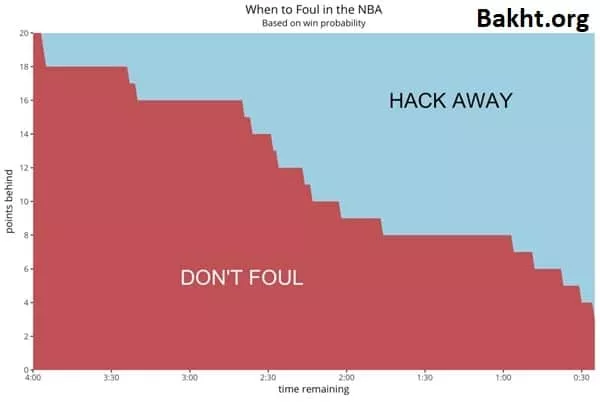 احتمالا حالا بیشتر متوجه منظور شدید. چنین نقشه راهی در خصوص بسکتبال وجود دارد. مربیان بسکتبال، تقریبا چنین ذهنیتی دارند چون اعداد درج شده در این دیاگرام، قابل قبول است. اینطور احتمالا بهتر میتوانید ذهنیت و شیوه فکر مربیها را متوجه شوید. خوب است بدانید که اینجا از یک استراتژی به اسم hack-a-shaq rule استفاده میشود. منظور خطاهای پیاپی (توسط بازیکنان متفاوت) روی بدترین پرتاب کننده پنالتی تیم حریف است.
