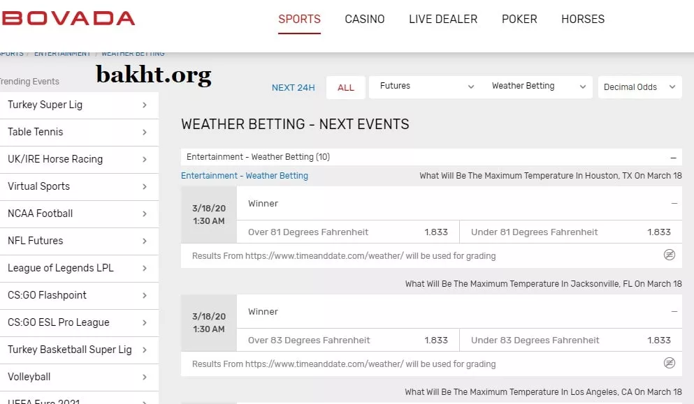 وبسایت شرط بندی بوادا به عنوان یکی از بهترین برندهای جهان، ساز و کاری به وجود آورده تا مشتریان روی وضعیت آب و هوا شرط بندی کنند. مثلا آنها به اینکه نیویورک سیتی امروز هفدهم مارچ دمایی بالاتر از 58 درجه فارنهایت (14.4 درجه سانتگراد) را تجربه نمیکند، ضریب -145 (انواع ضرایب شرط بندی) داده است. ضریب بالای 58 درجه، +105 است. طبق سابقه نیویورک سیتی و چیزی که کارشناسان آب و هوا میگویند، انتخابِ Under هوشمندانهتر است. در خصوص لوس آنجلس، ضریب شرط بندی روی دمای کمتر از 45 (7 درجه سلسیوس) -130 و شرط بندی بالای آن، -110 است. میتوانید در این سایت روی دمای شهرهای آمریکا و کانادا شرط بندی کنید.