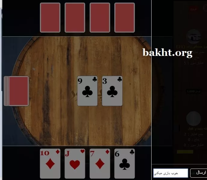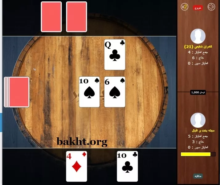 اینجا، جایی در میانههای بازی است. نفر اول 4 امتیاز و ما 5 امتیاز داریم. از سوی دیگر، رقیب 6 خاج جمع کرده که باعث میشود شانس بیشتری برای بردن بازی داشته باشد. امتیاز سور هر دو نفر نیز صفر است. این بین حتی میتوانید با رقیب خود مکالمه داشته باشید یا کُری بخوانید. البته این بنا بر این است که رقیب شما، مایل به ادامه مکامه یا حتی خواندن مسیجهای شما باشد.