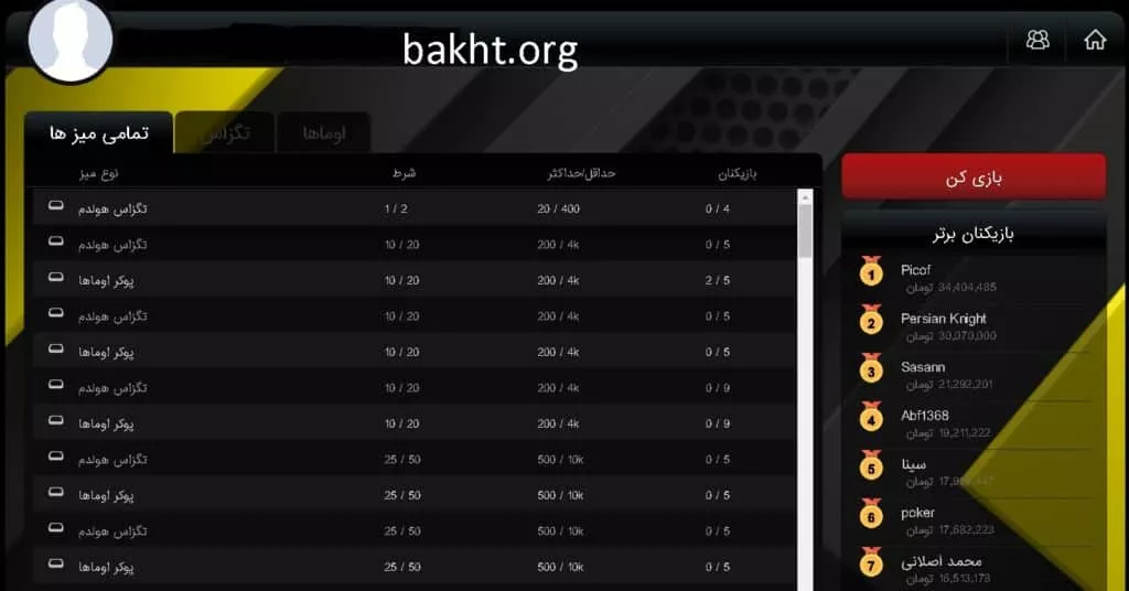 در صفحه ای که مشابه صفحه زیر باز میشود، در سمت چپ تمامی میزهای بازی را میتوانید مشاهده کنید. همچنین در سمت راست کاربران برتر معرفی شده اند.