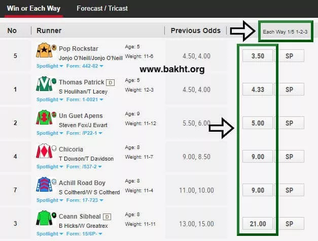 - بالا رفتن احتمال برد با انتخاب تنها یک برنده: در شرط بندی دو طرفه، در صورتی که تنها شرط مکانی برنده شود هم به سود میرسید.